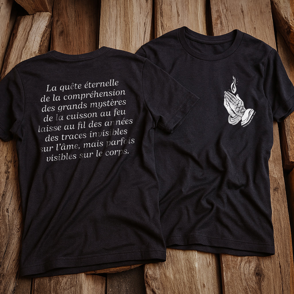 This T-shirt with its powerful symbolism pays tribute to culinary expertise and the eternal quest to understand the great mysteries of cooking over an open fire. Over the years, studying these phenomena leaves invisible traces on the soul, but sometimes visible ones on the body.
